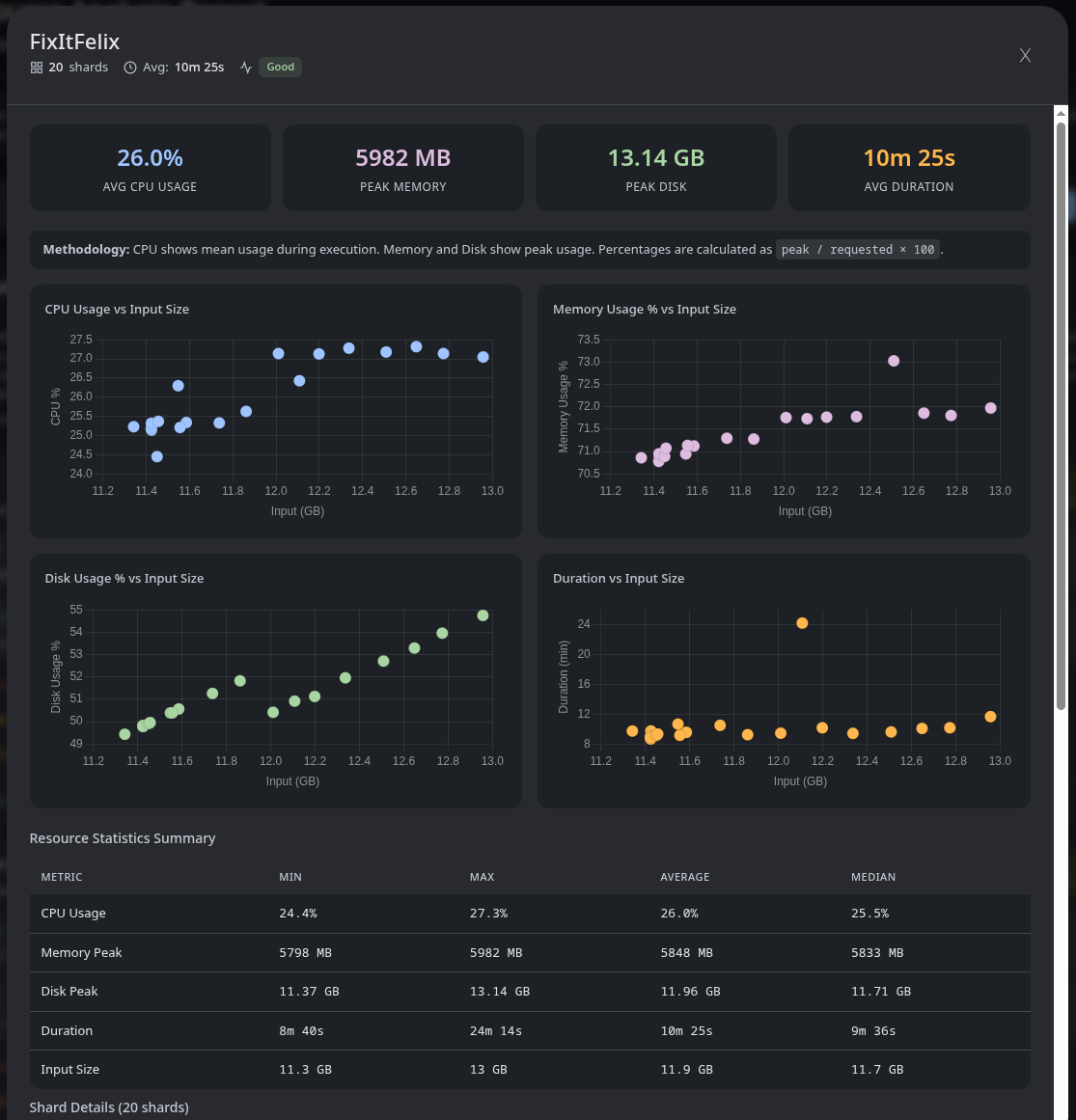 Pumbaa provides a structured and data-driven way to analyze resource utilization in Cromwell-executed workflows. By processing monitoring logs, it enables a per-task evaluation of CPU, memory, and disk usage, allowing you to correlate resource consumption with input size and identify concrete optimization opportunities.