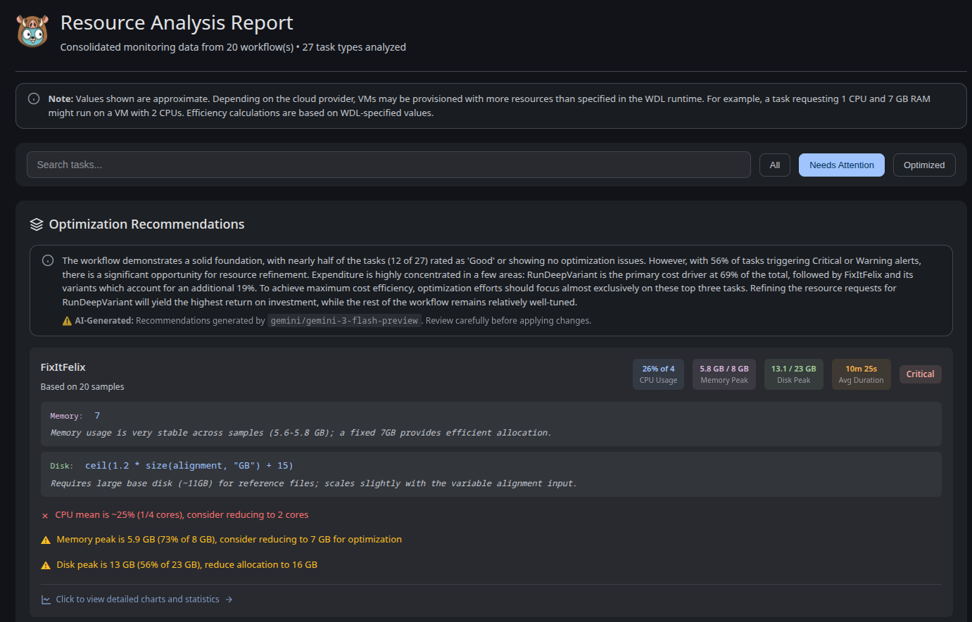 The generated output is a self-contained HTML file, viewable in any modern browser. It provides both a high-level summary of workflow efficiency and detailed per-task metrics.